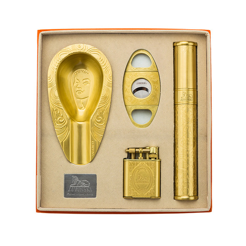 하이 엔드 시가 세트 순수 구리 4 피스 라이터 재떨이 가위 시가 튜브 선물 상자 세트